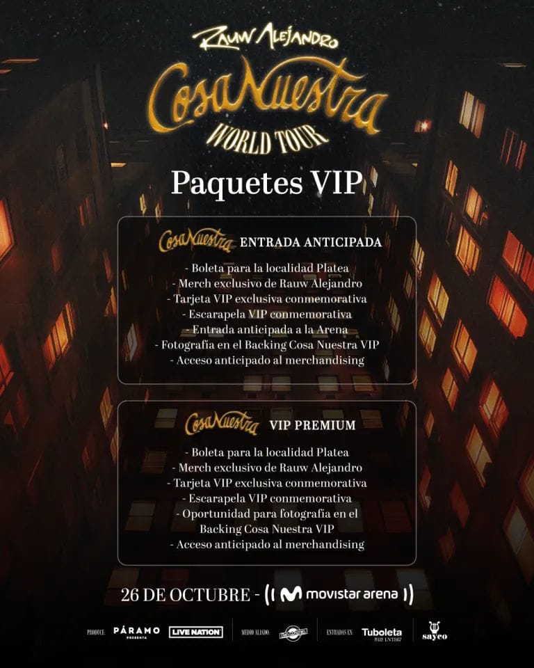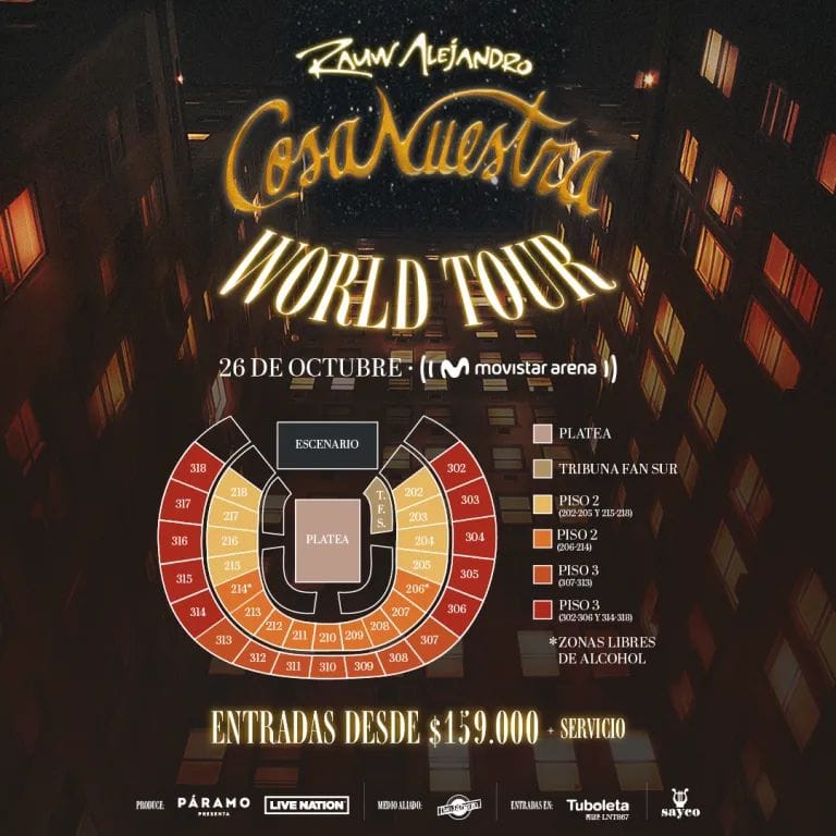 Rauw Alejandro llegará al Movistar Arena el 27 de octubre de 2025, después de agotar su primera fecha el 26 de octubre, como parte de la gira de su celebrado nuevo álbum Cosa Nuestra.